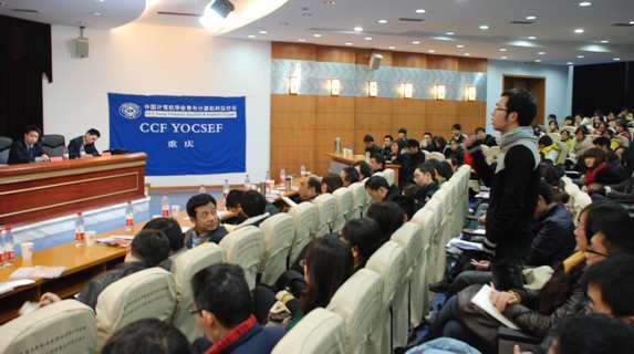 高校?企业?,究竟谁应该在卓越工程师的培养中占主导作用。CCF YOCSEF重庆特别组织了这次论坛。论坛共邀请到两位特邀讲者和两位特邀嘉宾,分别是重庆中天国际信息技术有限公司总经理熊东、重庆邮电大学教授钱鹰博士,重庆大学博士生导师文俊浩教授以及重庆师范大学李明教授。