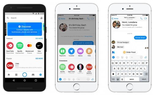 但Facebook并没有抛弃聊天机器人,而是围绕自己的目标设计更好的功能。此次发布的 Messenger平台2.0主要更新了四项功能:一个发现按钮,聊天扩展,智能回复和AI驱动的外卖。