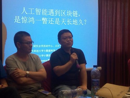 8月10日上午,在武汉天际丽豪大酒店举行了题为“众包知识图谱与区块链”研讨会暨“人工智能遇到区块链,是惊鸿一瞥还是天长地久?”专题论坛。本次研讨会及专题论坛由中国计算机学会武汉会员活动中心、CCF YOCSEF武汉联合主办,武汉科技大学大数据科学与工程研究院、武汉科技大学计算机科学与技术学院联合承办。邀请了阡寻信息科技有限公司董事长白硕、文因互联CTO鲍捷、中国科学技术信息研究所国家工程中心的常务副主任朱礼军研究员、英国阿伯丁大学计算科学系的Jeff Z. Pan教授、东南大学的崇志宏教授、中国科学院软件研究所的薛云志研究员等业内专家。本次会议分为两个环节,上午进行第一环节,即举行“众包知识图谱与区块链”研讨会,下午进行第二环节,与会专家及参会人员进行了“人工智能遇到区块链,是惊鸿一瞥还是天长地久?”专题论坛。