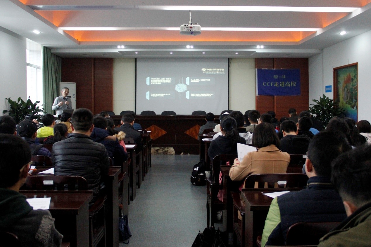 2017年11月29日,“CCF走进高校”活动来到湖南科技大学,邀请CCF常务理事、浙江大学软件学院常务副院长卜佳俊教授做了以“人工智能时代的‘盲点’—信息无障碍”为主题的精彩学术报告。学校教师和部分研究生、本科生参加了此次报告会,院长刘建勋出席并主持了此次报告会。