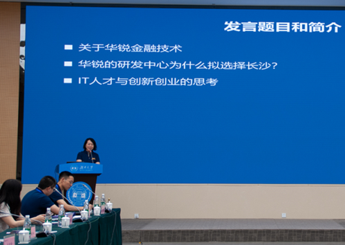 苗咏发言题目是“IT 人才与创新创业的思考”, 她的发言介绍华锐的研发中心为什么拟选择长沙?并从人力成本、地理优势等方面对未来IT 人才在长沙的创新创业进行了憧憬。