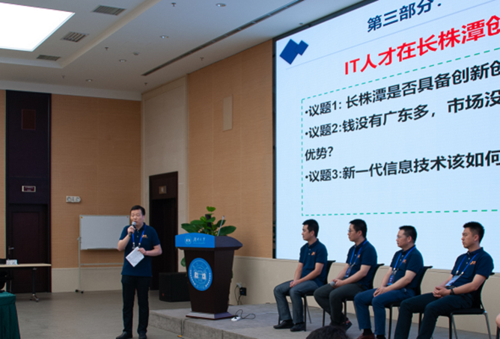 接下来是创星集团董事长文建全、兴盛优选人力资源总经理琚兆刚、国家超算长沙中心副主任彭绍亮、湖南天易众创孵化器公司马靖经理四位嘉宾针对自己对IT 人才在长株潭创新创业的观点发表看法。创星集团董事长文建全发言认为长沙具备基础设施完善、平台效应突出、应用场景丰富、人才支撑有力、政策体系领先等比较优势,为IT人才在长创新创业开创了良好的条件。兴盛优选人力资源总经理琚兆刚在发言中分析了长株潭未来IT产业的发展良好前景。国家超算长沙中心副主任彭绍亮站在高校教师的角度解释为什么目前IT人才会流失,并举如何留住IT人才给了几点建议。湖南天易众创孵化器公司副总经理王志强发言认为目前长株潭IT发展中过多的资源向长沙倾斜,忽略了株洲湘潭的作用,这某种程度上会影响未来的发展。
