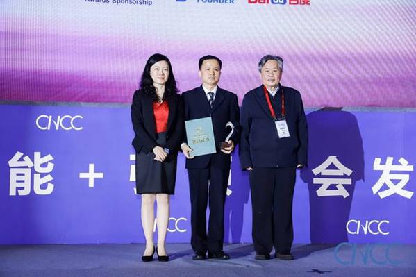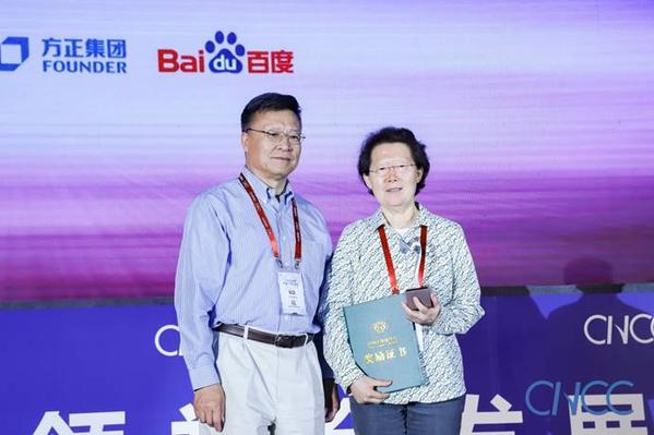 CCF名誉理事长李国杰(右一)、北大方正信息产业集团代理CEO左进女士(左一)为汪滔(张晓楠女士代)颁奖
