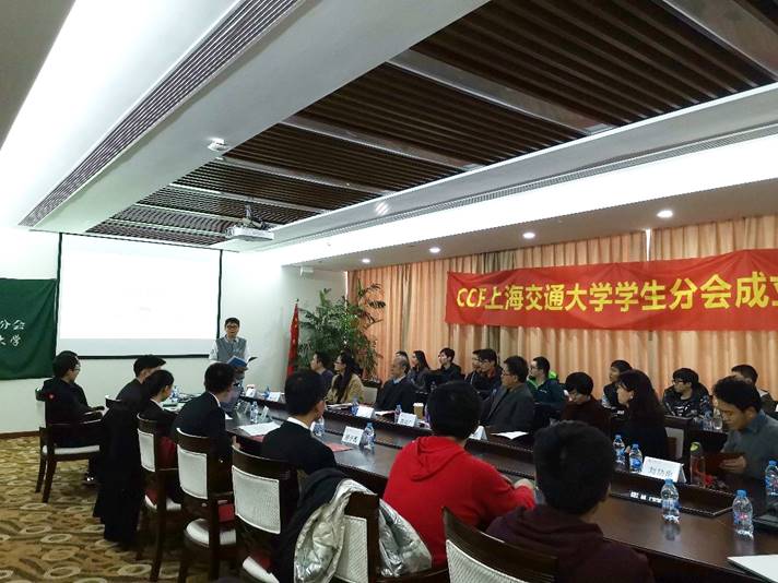 2019年3月20日,中国计算机学会(CCF)上海交通大学学生分会(以下简称“CCF上交大学生分会”)成立大会顺利举行,这是CCF在上海成立的第1个学生分会,也是在全国成立的第45个学生分会。出席本次成立大会的有CCF会士、CCF常务理事、上海交通大学教授过敏意,CCF学生分会工作组组长、CCF理事、西安电子科技大学教授苗启广,上海交通大学计算机系主任、上海交通大学教授张丽清,同济大学计算机联合党总支副书记张砚秋。参加本次成立大会的还有同济大学学生代表谢英杰、华东师范大学学生代表胡铭、CCF上海交通大学学生会员和各学院学生代表。大会由CCF上海会员活动中心秘书长、上海交通大学教授吴帆主持。