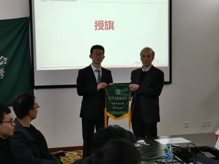 过敏意宣布CCF上交大学生分会督导主任、执委会名单,苗启广向督导主任、执委会颁发证书,张丽清为学生分会授旗。