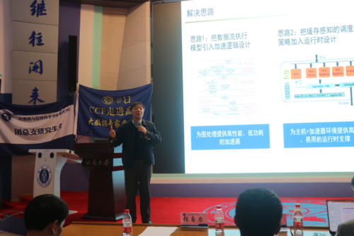 金海的讲座题目是《图计算加速器:挑战与趋势》。报告首先为大家系统地回顾了图计算的演变发展。其次讲解了面对大数据产业的深入发展,图计算在通用处理器上正面临着并行效率低、访存随机性强以及数据冲突频度高等突出问题。报告探讨了通过采用数据流执行模型引入加速逻辑设计,以及把缓存感知的调度策略加入运行时设计来提升图计算性能降低处理器的能耗问题等方向的一些探索。展望了对图计算加速器以及软件生态构建中存在的技术挑战和发展机遇。