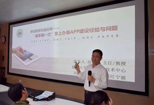 随后,温州大学现代教育技术中心主任胡来林作了《移动智慧校园应用》的报告,他围绕设计与开发“我的温大”APP平台、构建校务服务理论模型、理清校务服务清单与问题、支持校务服务线上办事、提供服务技术支撑、推进校务服务改革等6个方面,向与会人员深入分享了“最多跑一次”掌上APP的建设经验与问题。