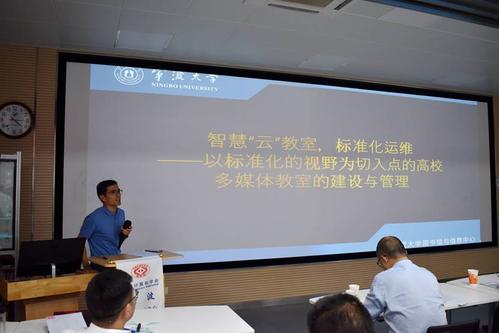 宁波大学图书馆与信息中心副主任董其军作了《智慧教室 标准运维》的分享,以标准化的视野为切入点,详细介绍了高校多媒体教室的建设与管理,并希望通过打造智慧教室云服务平台,为广大师生提供一流服务。