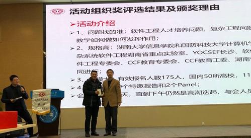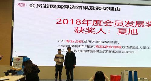 年度总结之后,长沙分部进行了隆重的表彰颁奖典礼。2018年度CCF长沙分部颁发了会员发展奖、活动组织奖和特殊贡献奖,以表彰在2018年为分部作出贡献的个人和团体。分部秘书长张锦向会员汇报了三个奖项的评选规则,其中:会员发展奖根据总部统计的会员发展人数确定;活动组织奖综合考虑活动规模、影响力、与分部特色关联度等因素进行确定;特殊贡献奖是根据对分部发展作出长期、突出贡献的个人,每年度不超过2人,每人只能获得一次。最终2018年评出的获奖人员如下:湖南安全技术职业学院夏旭荣获会员发展奖;国防科技大学毛新军荣获活动组织奖;国防科技大学卢凯荣获特殊贡献奖。