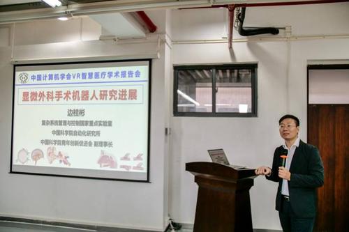边桂彬博士报告主题为“智能显微外科手术机器人研究进展”。边博士是中国科学院自动化研究所复杂系统管理与控制国家重点实验室研究员、中国科学院大学硕士生导师,拥有国家重点研发计划首席科学家,中国科学院青年创新促进会会员,英国皇家学会“牛顿基金”获得者,IEEE神经机器人系统技术委员会委员,中国公共服务机器人标准化工作组专家委委员等多项学术头衔。他研制开发了一系列机器人平台,包括血管介入手术机器人、肝肿瘤穿刺机器人、双臂机器人、多自由度力位交互装置、下肢康复机器人等。