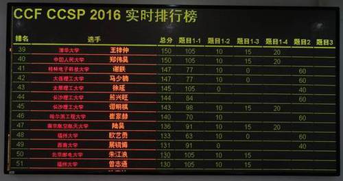 2016  CCF大学生计算机系统与程序设计竞赛(CCF Collegiate Computer Systems& Programming Contest, CCF  CCSP)于11月26日在北京成功举办。竞赛由中国计算机学会(CCF)主办,清华大学等15所著名高校共同发起,旨在提高全国高校计算机教育水平。本次竞赛由北京理工大学承办,现场汇集了全国39个城市51所高校的324名优秀选手。这是一次全国大学生计算机高手的现场较量。
