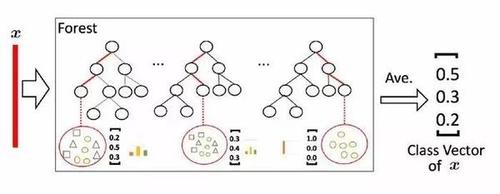 给定一个实例,每个森林会通过计算在相关实例落入的叶节点处的不同类的训练样本的百分比,然后对森林中的所有树计平均值,以生成对类的分布的估计。如图2所示,其中红色部分突出了每个实例遍历到叶节点的路径。
