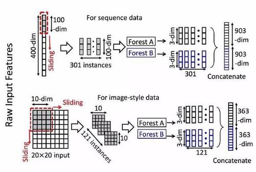如图3所示,滑动窗口用于扫描原始特征。假设有400个原始特征,并且使用100个特征的窗口大小。对于序列数据,将通过滑动一个特征的窗口来生成100维的特征向量;总共产生301个特征向量。如果原始特征具有空间关系,比如图像像素为400的20×20的面板,则10×10窗口将产生121个特征向量(即121个10×10的面板)。从正/负训练样例中提取的所有特征向量被视为正/负实例;它们将被用于生成如 2.1节中所说的类向量:从相同大小的窗口提取的实例将用于训练完全随机树森林和随机森林,然后生成类向量并连接为转换后的要素。如图3所示,假设有3个类,并且使用100维的窗口;然后,每个森林产生301个三维类向量,导致对应于原始400维原始特征向量的1,806维变换特征向量。