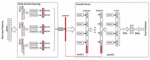 图4:gcForest的整体流程。假设有三个类要预测,原始特征是400-dim,使用了三个尺寸的滑动窗口。