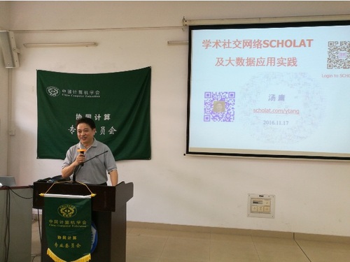 2016年11月17日,CCF协同计算专业委员会走进广东工业大学,CCF协同计算专委会副主任、华南师范大学教授汤庸应邀作了题为《学术社交网络及大数据研究与应用实践》的学术报告。专委常务委员滕少华教授,委员梁路副教授、刘冬宁副教授及广东工业大学计算机学院领导和师生60余名人参加了此次活动。